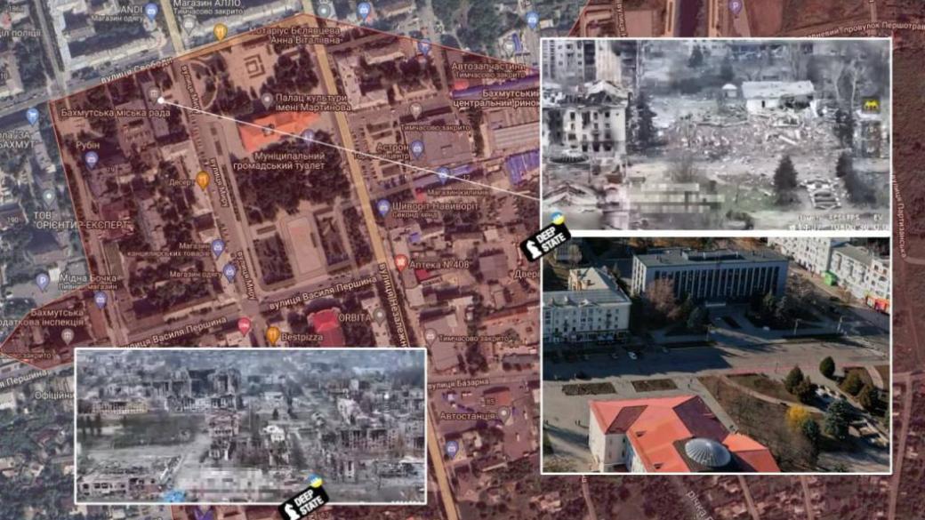 Здание Бахмутского горсовета на данный момент полностью уничтожено в результате мощнейших обстрелов города. Об этом сообщает Deep State.