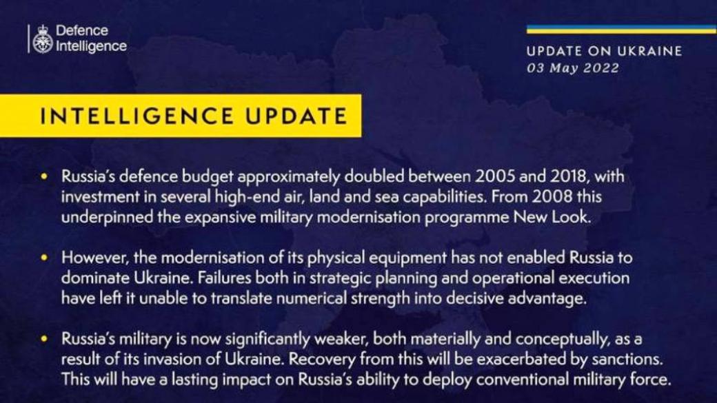 В Минобороны Британии добавили, что российская армия в результате вторжения в Украину сейчас значительно слабее, как материально, так и концептуально, а ее восстановление будет усугублено санкциями, что окажет долгосрочное влияние на способность России развертывать обычные вооруженные силы.