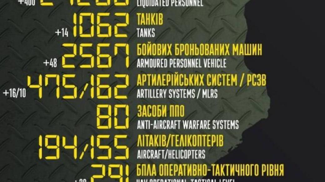Россия за сутки потеряла в Украине почти 500 военных, самолет, вертолет и десятки танков