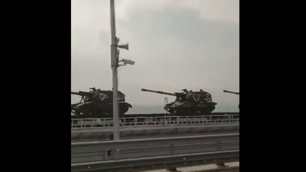 В сети показали видео Крымского моста на котором видно, как в сторону оккупированного Крыма массово движутся колонны военной техники войск РФ и цистерны с горючим.