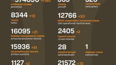 Статистика потерь армии рф от Генштаба ВСУ за минувшие сутки