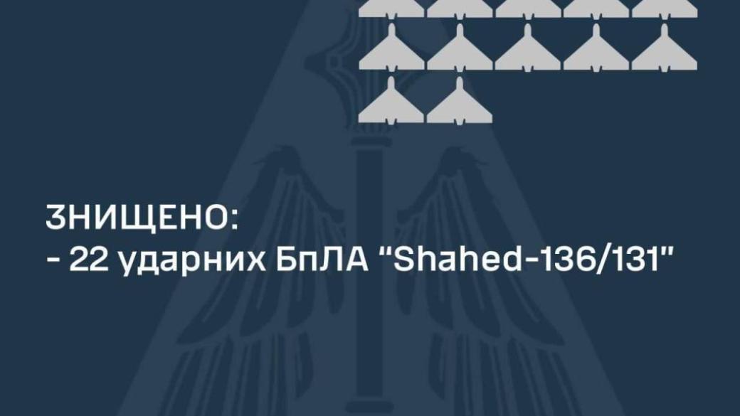 Как сообщили в Генштабе ВСУ, 25 российских дронов-камикадзе атаковали юг Одесщины, 22 из них сбиты.