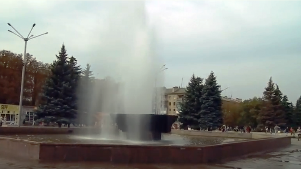 На площади Победы все еще работает городской фонтан, вокруг которого гуляют люди.