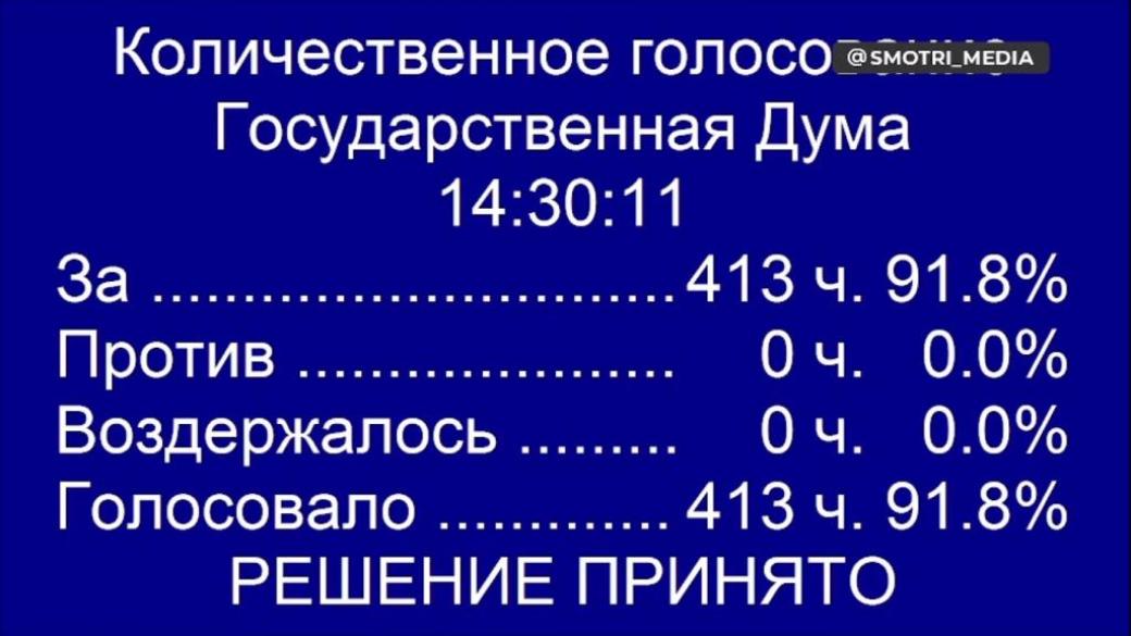 Проголосовали "за" все 413 депутата, присутствующих в зале.