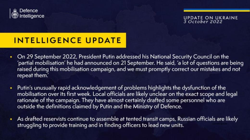 В британской разведке уточняют, что Путин 29 сентября 2022 года обратился к своему совету национальной безопасности из-за мобилизации, о которой он объявил 21 сентября. По его словам, в ходе этой мобилизационной кампании возникает много вопросов, "и мы должны оперативно исправлять свои ошибки и не повторять их". В британском ведомстве подчеркивают: