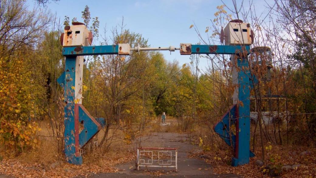 На фото показаны давно проржавевшие фигуры роботов, на которых облущилась краска, все остальные аттракционы также выглядят ужасно, все вокруг поросло травой. Данный парк расположен в одной из горячих точек города, и неоднократно подвергался обстрелу.
