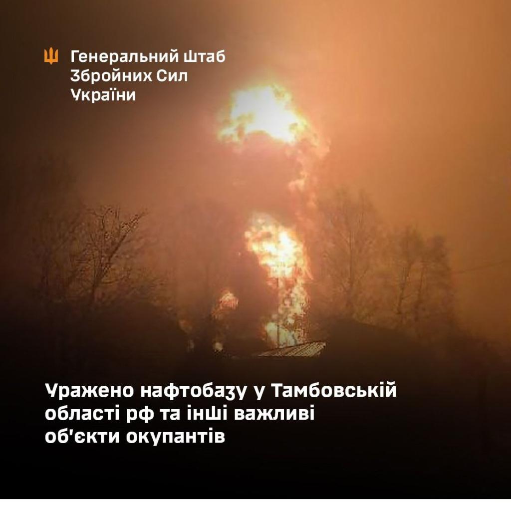 Украинские войска поразили нефтебазу в Тамбовской области россии и другие важные объекты оккупантов. Об этом сообщает Генштаб ВСУ,