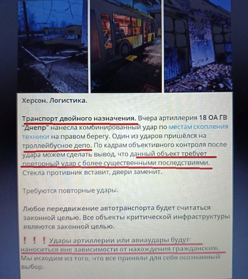 Популярный российский Телеграм-канал (53 000 подписчиков, официально зарегистрирован в Роскомнадзоре) назвал пассажирский транспорт Херсона "транспортом двойного назначения" и призвал наносить по нему артиллеристские и ракетные удары. Об этом сообщает «ОстроВ».