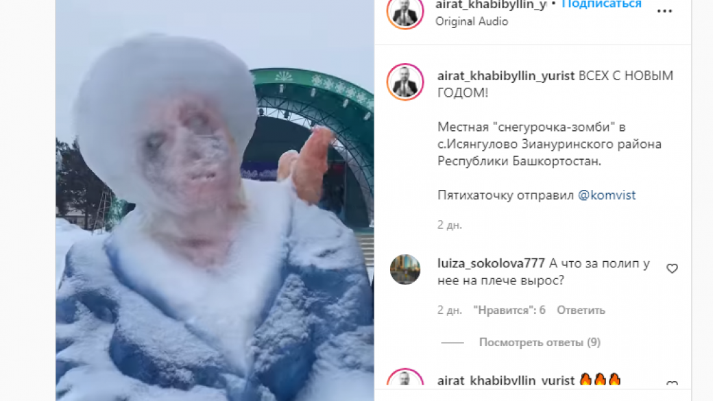 В России в Зиануринском районе Республики Башкортостан местные жители слепили из снега «Снегурочку-зомби». Плод труда россиян показал местный житель Айрат Хабибуллин в своем Instagram.