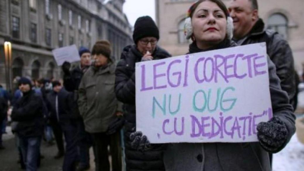 Участники акции хором исполнили гимн Румынии, держа в руках румынские флаги и плакаты с надписями «Аннулируйте постановление», некоторые держат картонные куклы в виде членов кабинета в тюремных робах.