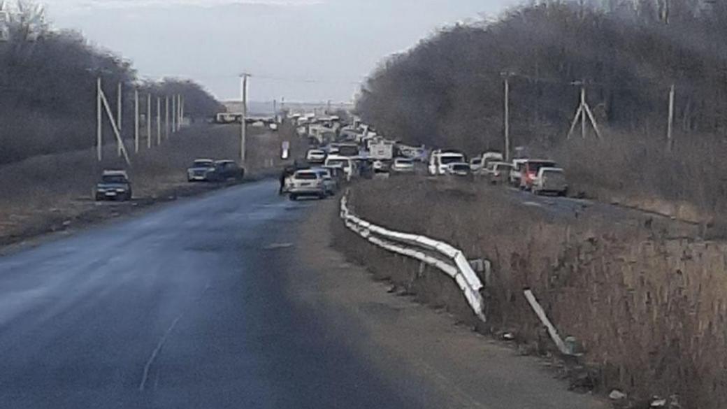 На КПВВ «Еленовка» на Мариупольском направлении люди жалуюбтся на очень скользкую дорогу, очереди довольно большие: