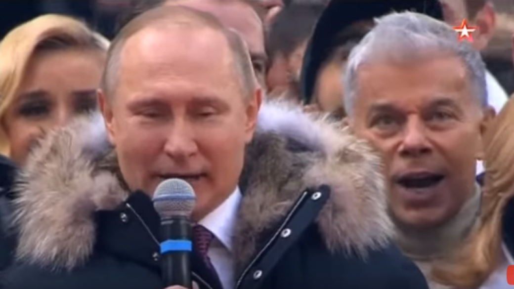 Президент РФ Владимир Путин спел гимн России в ходе митинга в поддержку своей кандидатуры на предстоящих президентских выборах 18 марта.