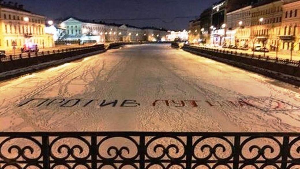 Сегодня ночью в Санкт-Петербурге за надпись на льду реки Фонтанка, в которой упомянут президент РФ Владимир Путин, полиция задержала волонтеров предвыборного штаба российской телеведущей Ксении Собчак.