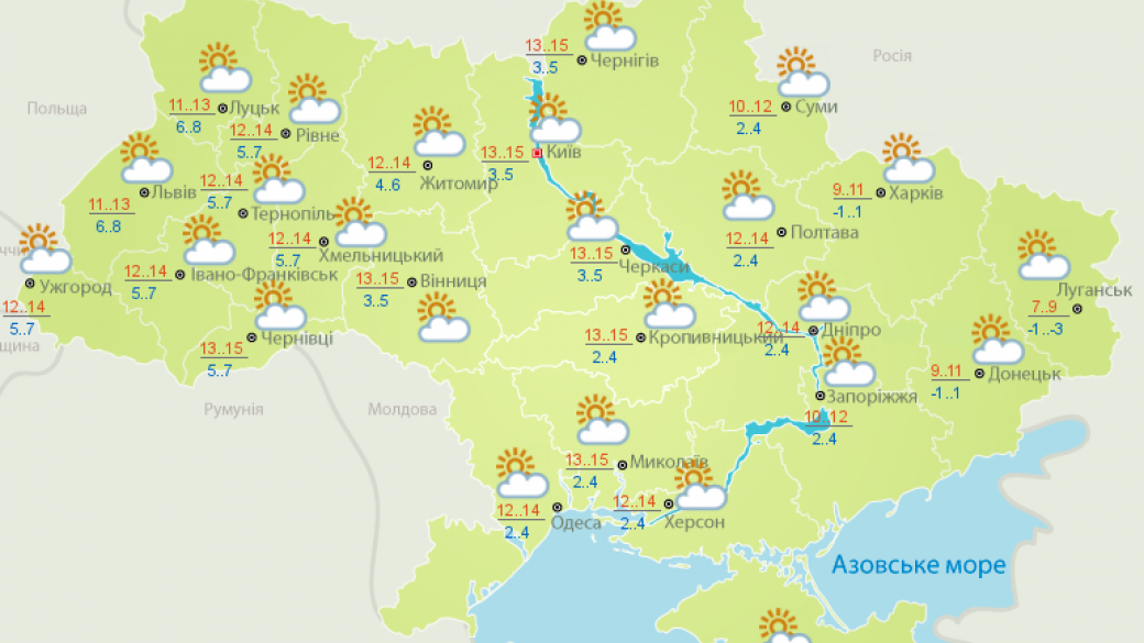Так, на западе ожидается 11−15 градусов тепла, на востоке +7+14, на севере +10+13, на юге и в Крыму +5 +15.