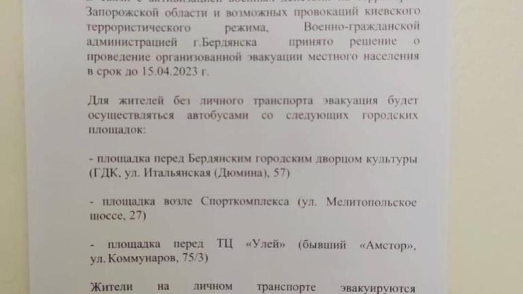 В захваченном РФ Бердянске Запорожской области в «связи с активизацией военных действий» объявлено о начале эвакуации гражданского населения в срок до 15 апреля 2023 г. Соответствующее фото объявления от имени оккупационной администрации Бердянска о подготовке к эвакуации населения появилось в соцсети.