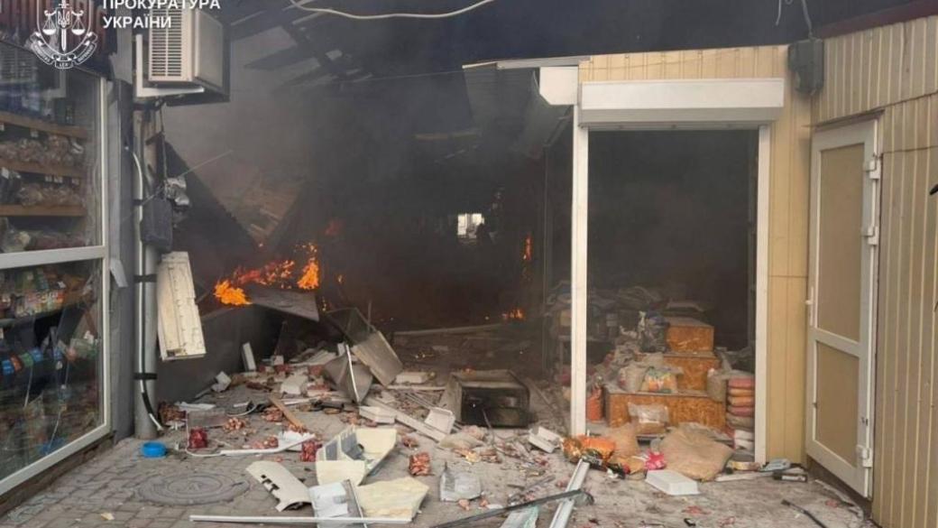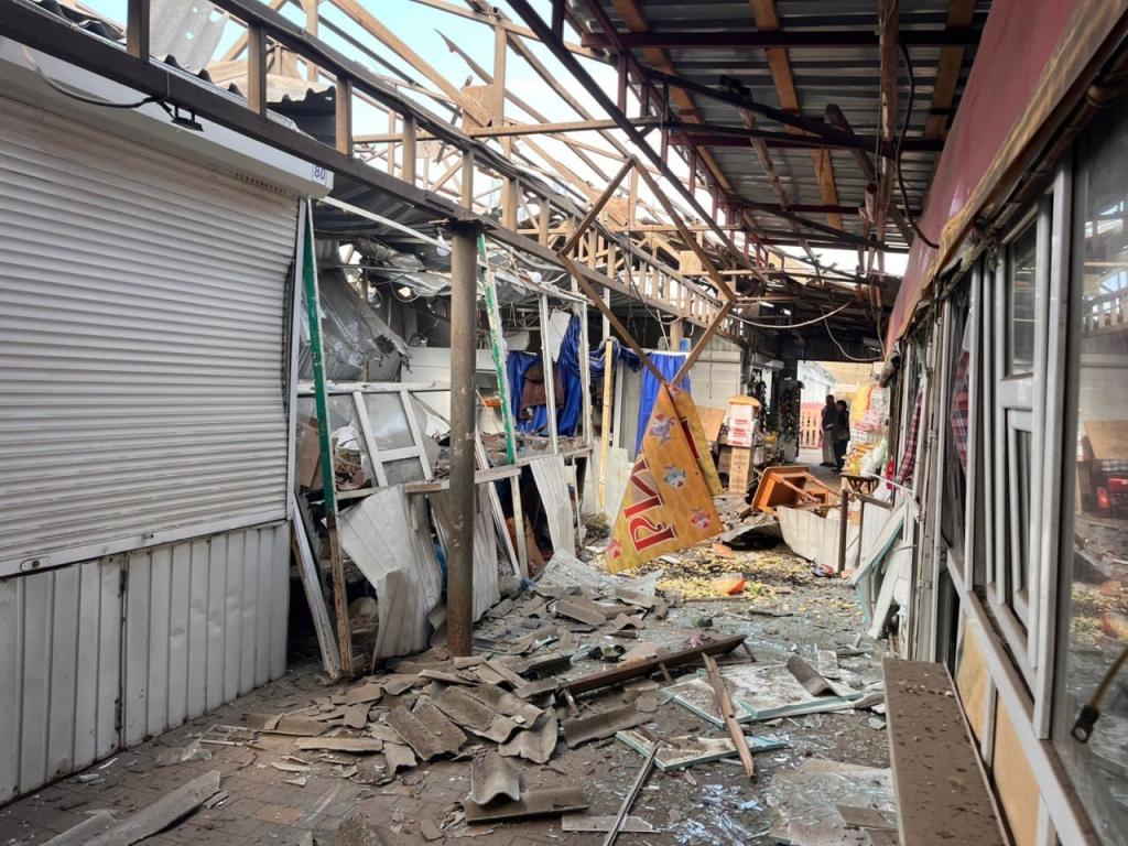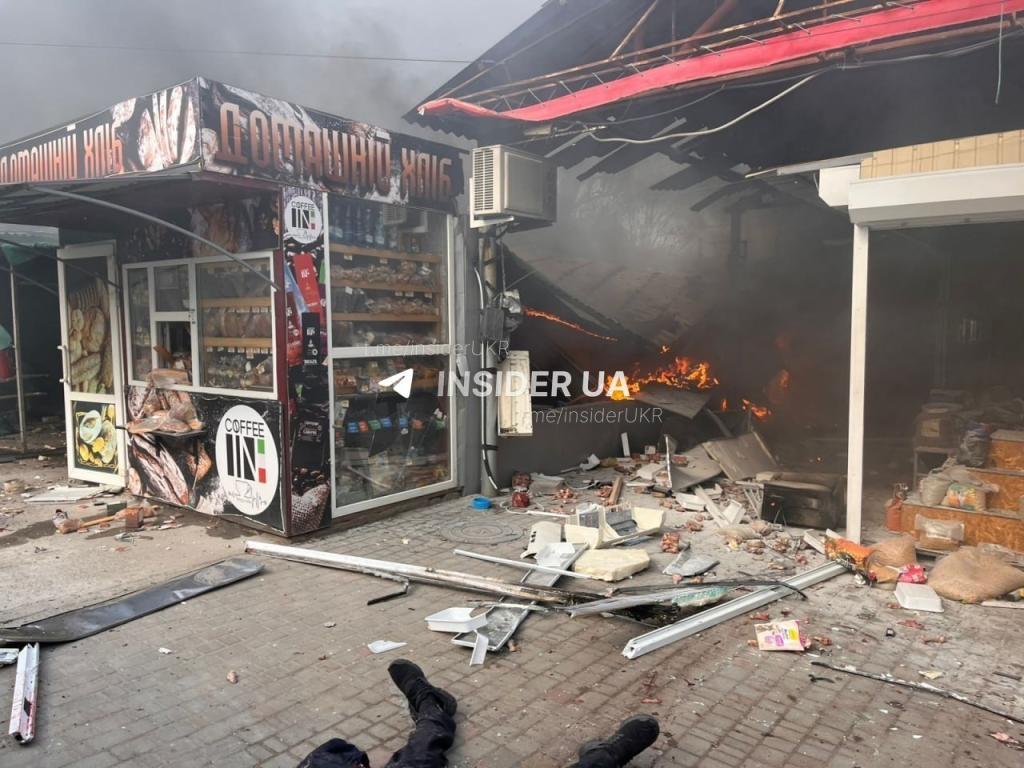 Из-за попадания возник пожар. Также повреждены торговые павильоны и магазин.