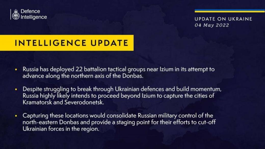 Россия развернула 22 батальонные тактические группы под Изюмом харьковской области, пытаясь продвинуться в направлении северного Донбасса. Об этом сообщает Минобороны Британии о ссылкой на британскую разведку.