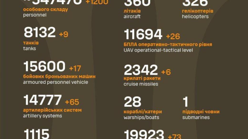 За прошедшие сутки ВСУ ликвидировали 1200 оккупантов и более 200 единиц вражеской техники.