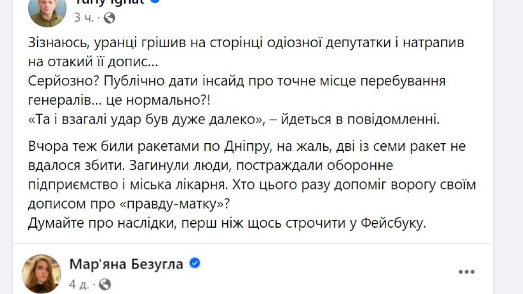 Представитель Воздушных сил ВСУ Юрий Игнат на своей странице в соцсети обратил внимание на то, что народный депутат, заместительница председателя комитета по вопросам национальной безопасности, обороны и разведки Марьяна Безуглая своим постом в Фейсбук слила данные о пребывании в больнице Днепра экс-командующего Объединенными силами ВСУ Юрия Содоля и экс-командующего оперативно-тактической группировкой "Харьков" Юрия Галушкина.