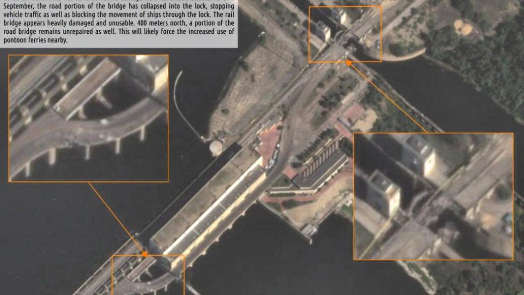Опубликовано спутниковое фото Каховского моста, на котором видно, что переправа получила ряд серьезных повреждений.