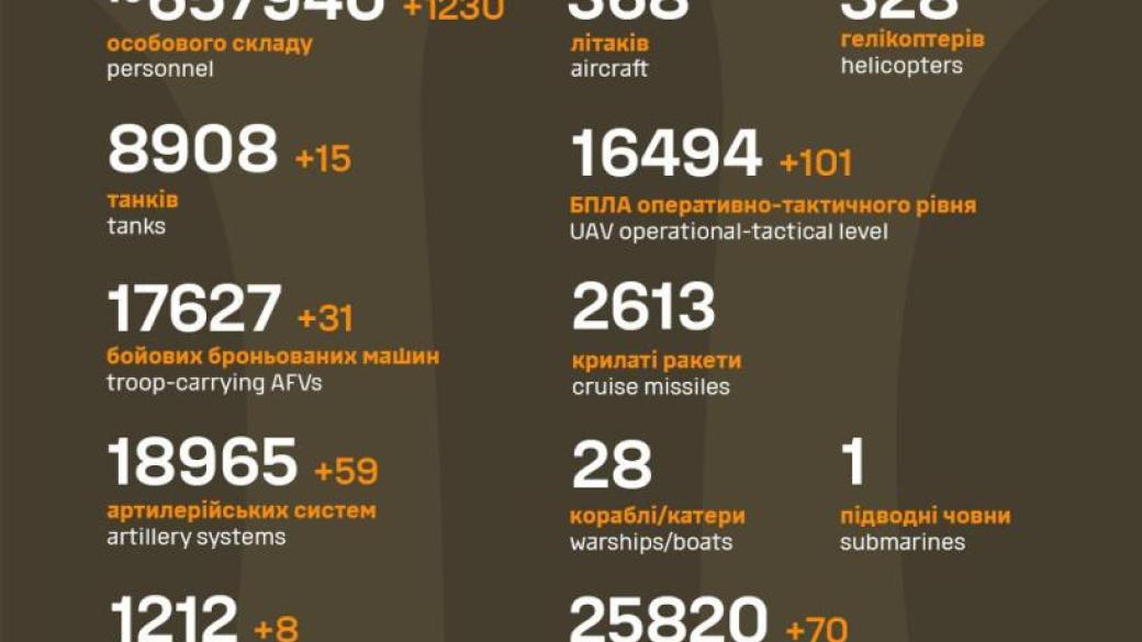 Силы обороны ликвидировали 1230 оккупантов и уничтожили 288 единиц техники и вооружения.