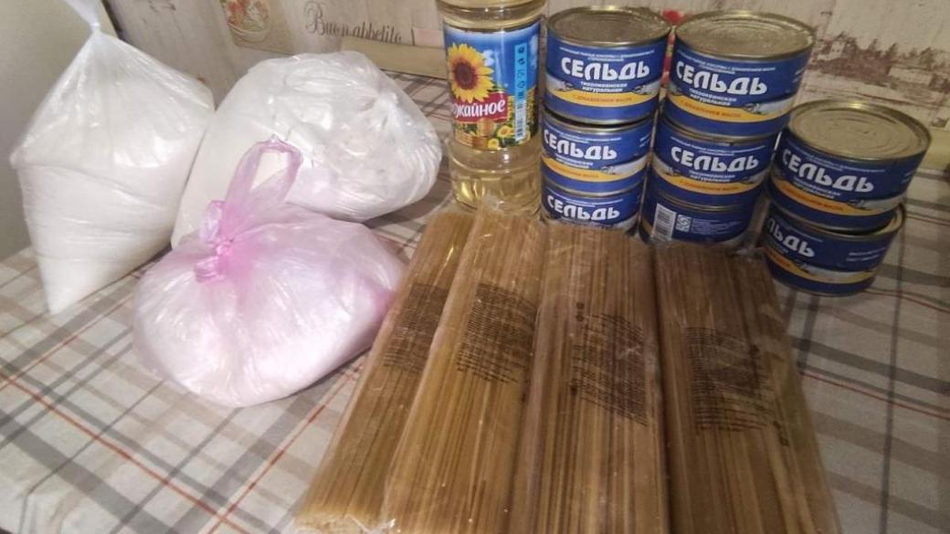 Судя по фото, пенсионер в оккупированном городе должен прожить месяц на нескольких пачках макарон, килограме сахара, бутылке подсолнечного масла, восьми банках рыбных консерв и нескольких кг муки.