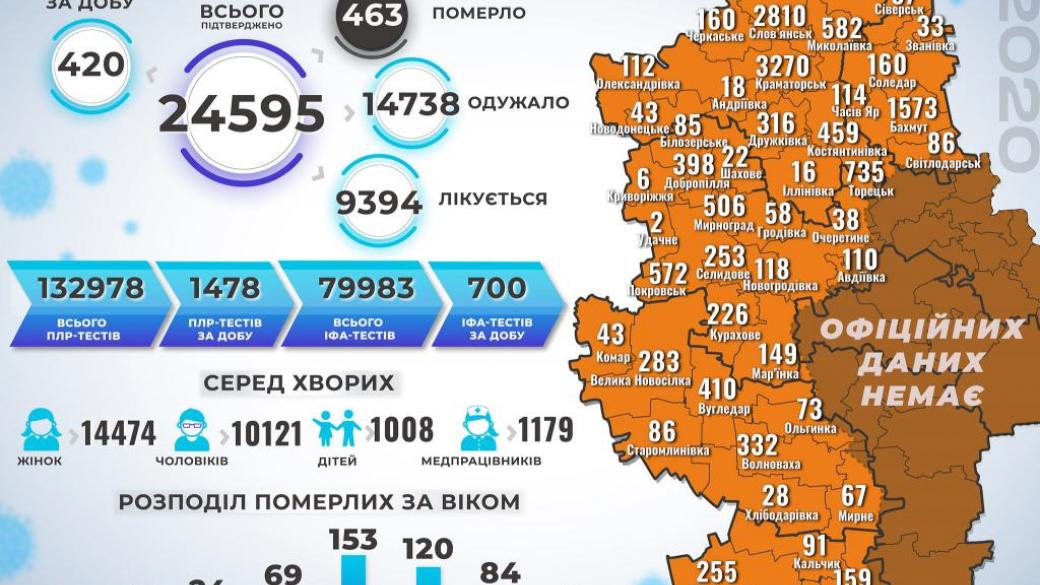 Всего с начала пандемии на подконтрольной Украине части Донецкой области выявлено 24 595 заболевших коронавирусом. Из них 14 738 человек выздоровели, а 463 умерли. Продолжают лечение 9 394 пациентов.