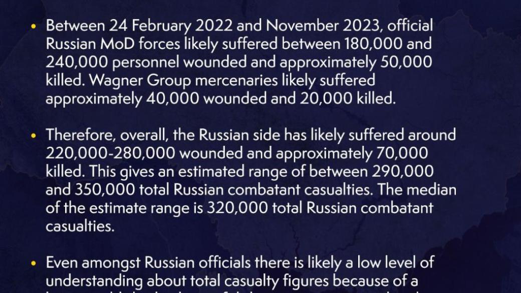 "Соответственно, в целом вероятно, что российская сторона понесла потери ранеными в количестве около 220-280 тыс и убитыми около 70 тыс. Это позволяет говорить о примерном количестве российских боевых потерь на уровне от 290 тыс до 350 тыс.".