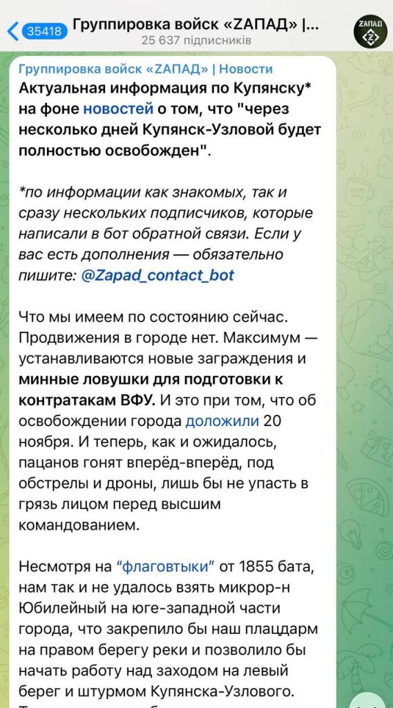 По данным каналов DONTSOPWAR и "Группировка войск "ЗАПАД"", никакого реального продвижения у российских войск нет. Линия фронта стоит, бои идут локально, а заявления о контроле над городом — просто красивые слова для Z-телевидения. Российские позиции не меняются, а логистика критически провалена. Снабжение осуществляют в основном по воздуху, из-за чего солдаты буквально выпрашивают дроны и боеприпасы. Их гонят в штурмы, чтобы прикрыть ложь Герасимова.