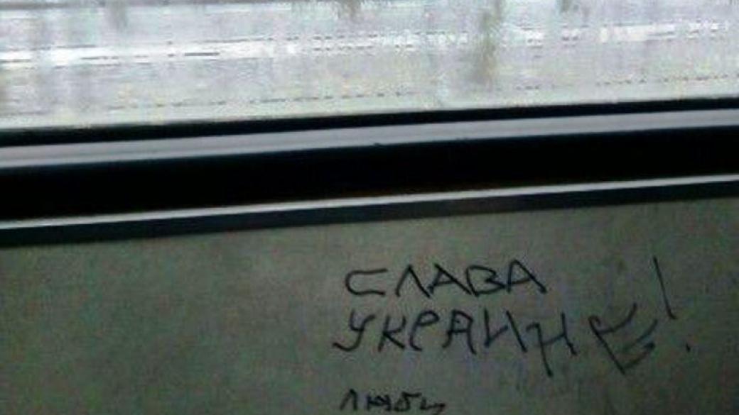 Так, на стене маршрутки маркером неизвестный пассажир оставил надпись «Слава Украине!», и чуть ниже — «Люби Украину».