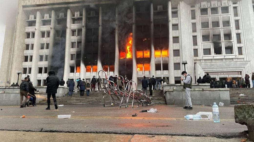 В настоящее время силы правопорядка покинули площадь возле акимата Алматы. Само здание охвачено огнем, также горит местная прокуратура.