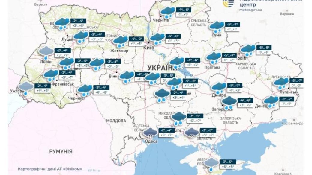 Ближайшей ночью на западе, а днем по всей территории страны ожидаются небольшие осадки в виде мокрого снега и дождя . Температура в ночные часы -8...-3, днем -1...+4, в Прикарпатье.