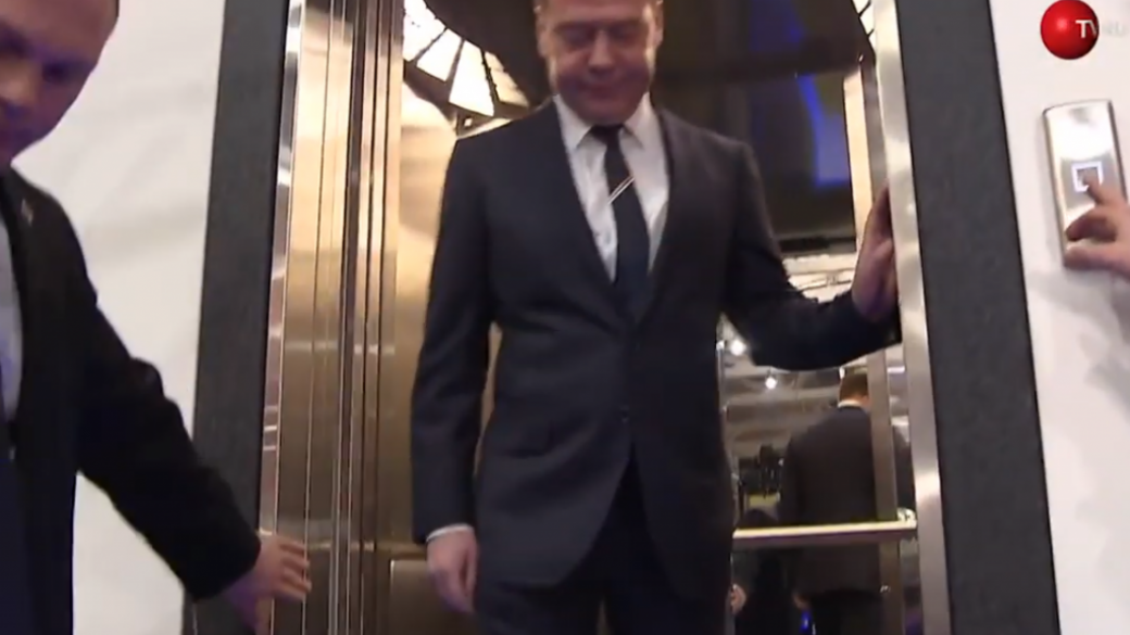 «Во время посещения Щербинского лифтостроительного завода премьер-министр РФ Дмитрий Медведев попал в неловкую ситуацию. Он чуть было не оказался „запертым“ в одном из лифтов»
