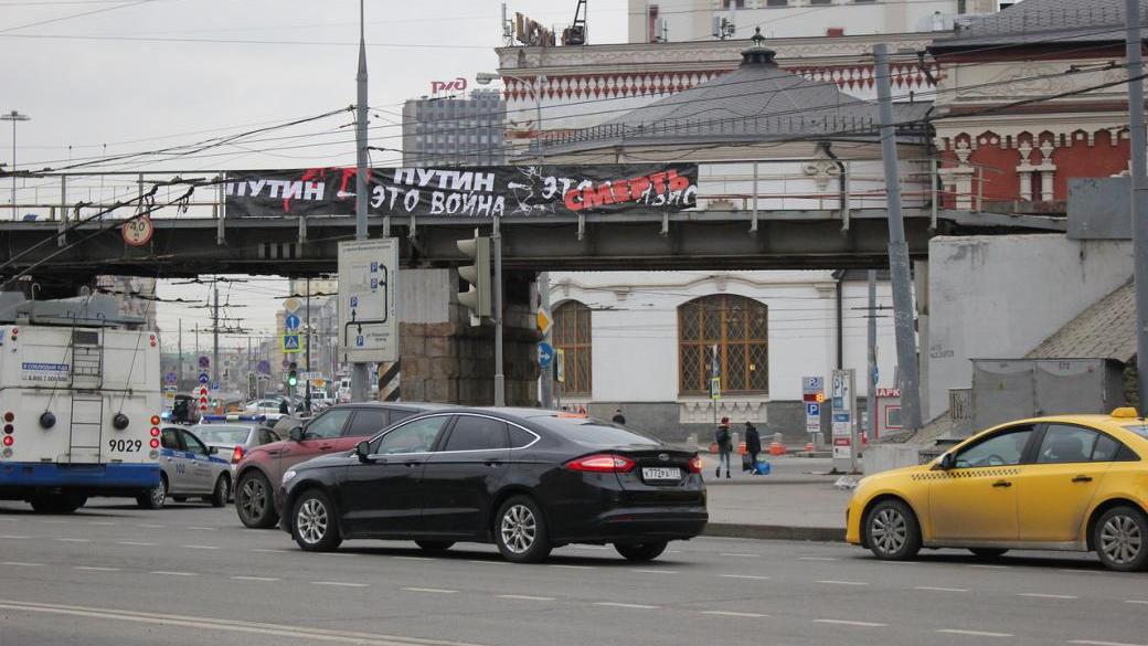 Сегодня активисты вывесили на мосту в центре Москвы баннер «Путин — это война. Путин — это смерть».