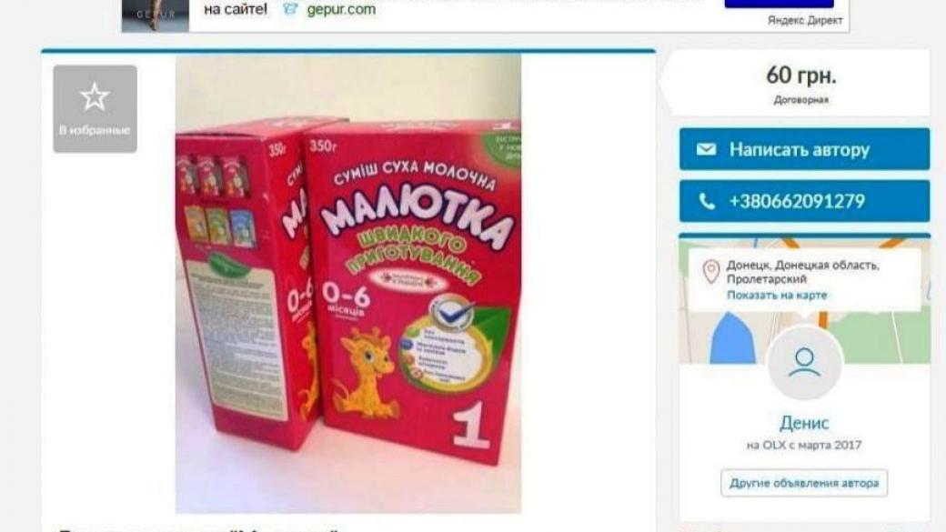 Судя по объявлениям, местные жители выставляют на продажу молочную смесь «Малютка» за 60 гривен, паштет из куриной печени за 10 гривен и сахар за 17 гривен.