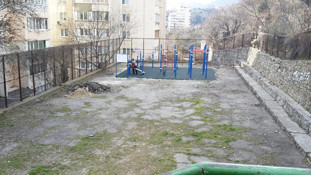 На втором фото — новая спортивная площадка в Гаспре, которая представляет собой огороженный сеткой участок территории с остатками старого асфальтового покрытия и небольшим клочком свежего асфальта под новыми турниками. Здесь также заметны какие-то кучи, по-видимому, остатки стройматериалов.