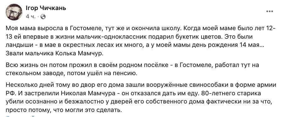 В Гостомеле российские военные убили старика за отказ накормить их.
