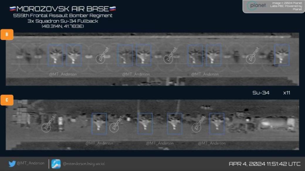Снимки аэродрома сделаны 4 апреля. По подсчетам на тот момент на аэродроме было 26 Су-34 и три Су-30/35.