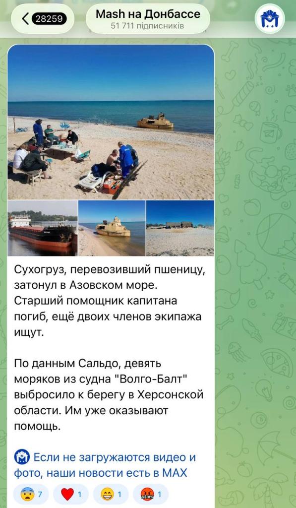 Российские пропагандисты пишут, что количество подтвержденных погибших возросло до двух. Судно находилось в 300 милях к северу от Керчи.