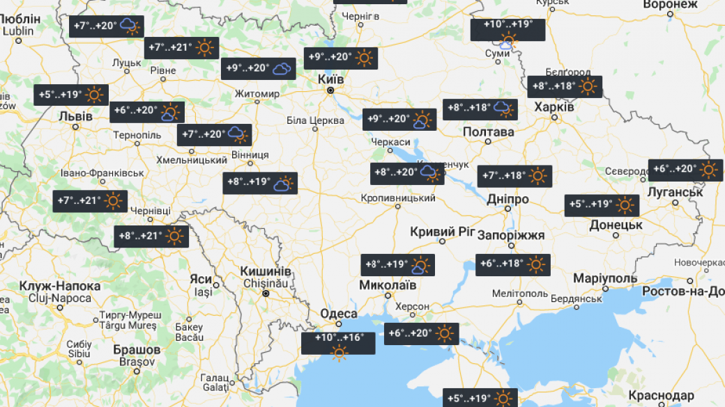 - В Кропивницком — облачно с прояснениями, температура ночью +8°, днем +20°.