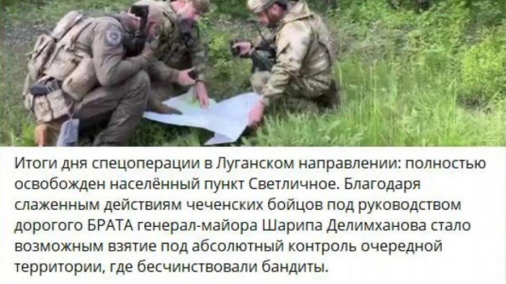 «Полностью освобожден населенный пункт Светличное. Благодаря слаженным действиям чеченских бойцов под руководством дорогого брата генерал-майора Шарипа Делимханова стало возможным взятие под абсолютный контроль очередной территории, где бесчинствовали бандиты».