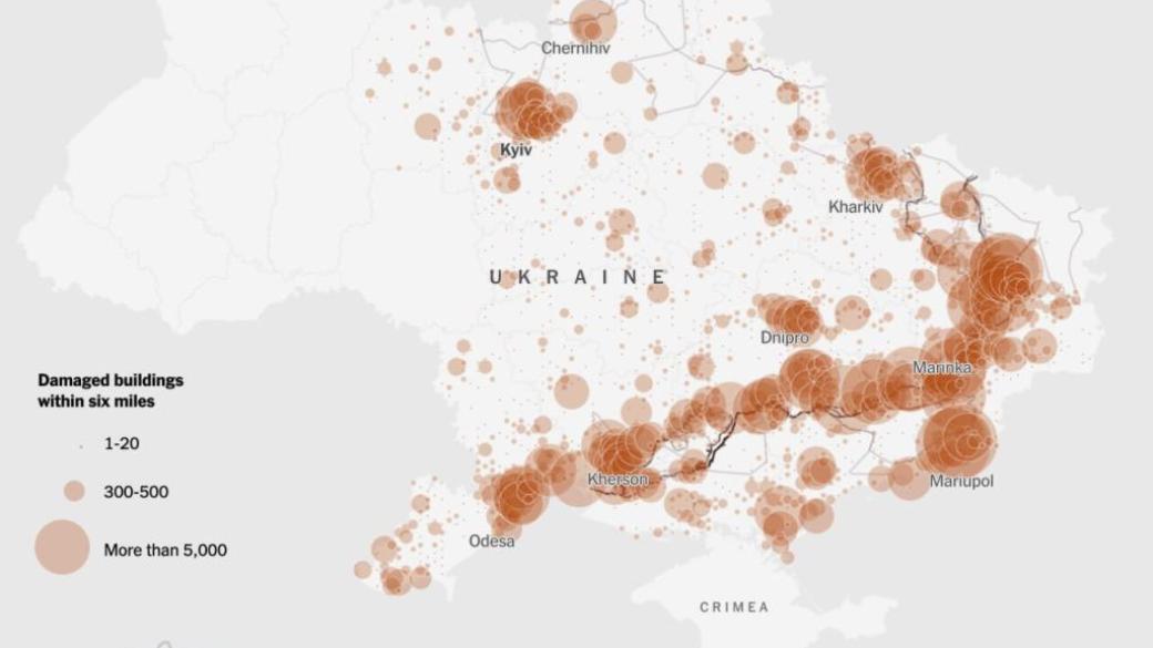 При этом порядка 900 поврежденных и разрушенных строений были объектами, которые защищены Женевскими конвенциями: 106 больниц (в том числе 18 в Мариуполе — самом пострадавшем городе), 109 церквей (34 в Мариуполе), 708 школ, университетов и колледжей (237 в Мариуполе).