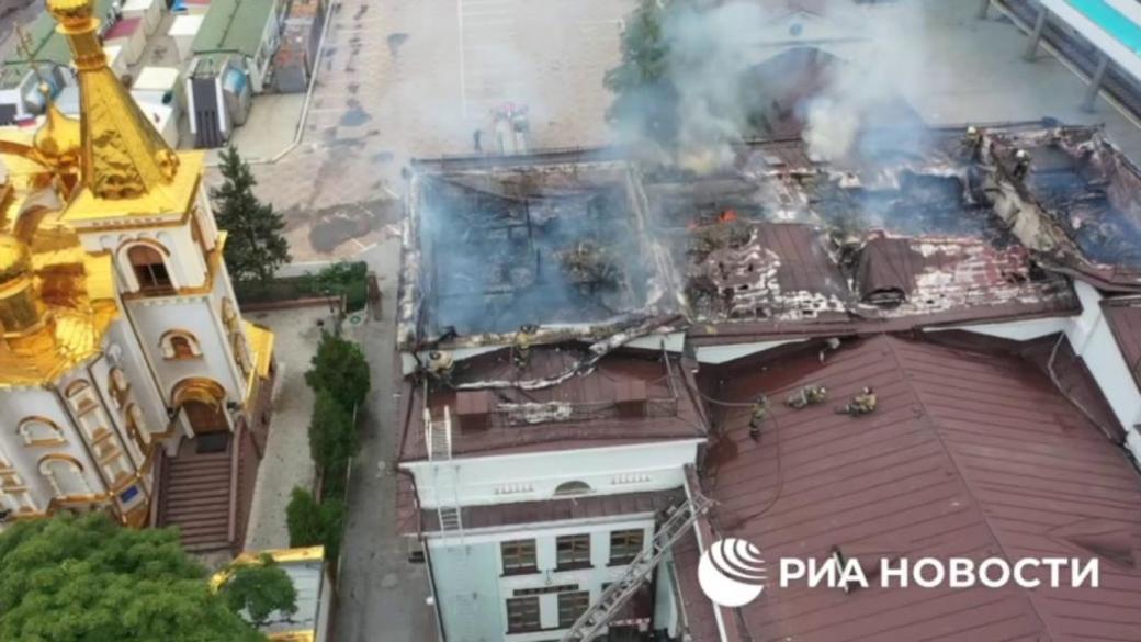Пожарные тушат на донецком вокзале пожар, возникший после прямого попадания украинского снаряда.
