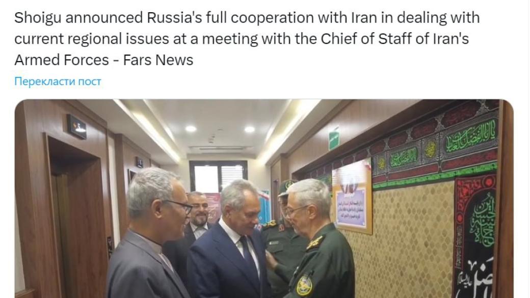 Шойгу встретился с начальником Генштаба ВС Ирана и заявил о полном сотрудничестве россии с Ираном в решении актуальных "региональных вопросов". Об этом сообщает израильские службы новостей.