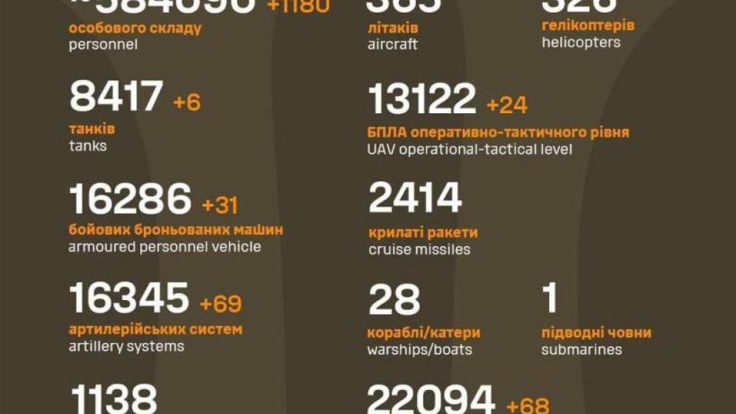 Силы обороны в течение прошедших суток ликвидировали 1180 оккупантов и 200 единиц вражеской техники.