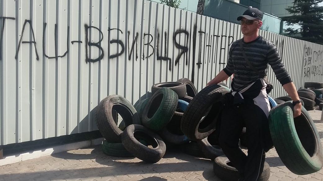У здания, где расположен офис «Интера», объявлен «бессрочный пикет». Участники акции получили целый грузовик автомобильный шин и собираются строить блокпост.