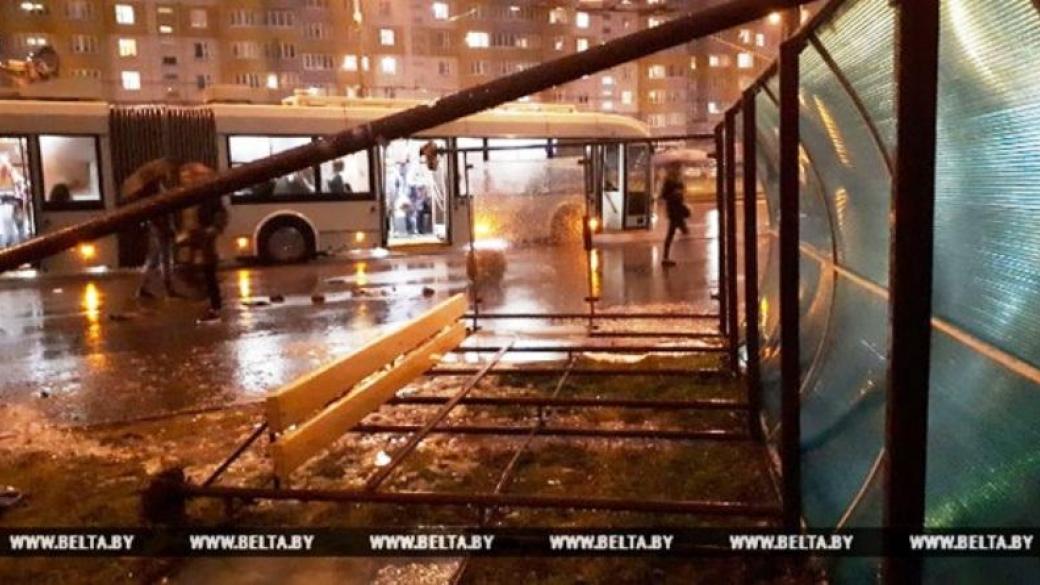 Сильный порывистый ветер опрокинул столице Беларуси Минске остановочный павильон в результате чего пострадали три человека.