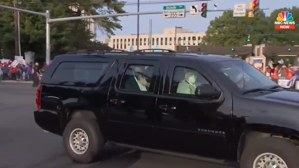 В Белом доме сообщили, что после короткой поездки кортеж вернулся на территорию медицинского центра имени Уолтера Рида.