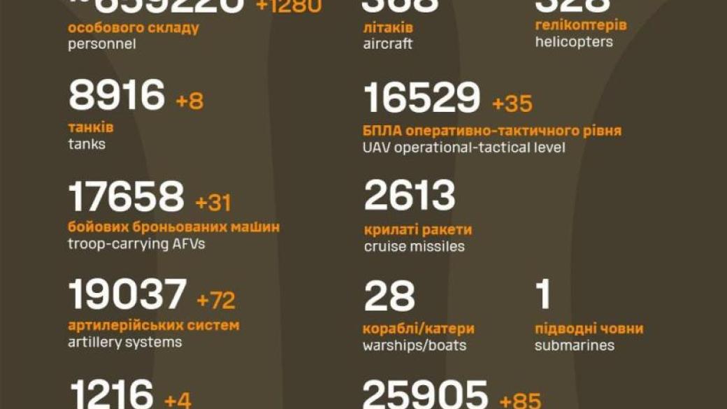 За минувшие сутки Силы обороны ликвидировали 1280 оккупантов и более 250 единиц техники.