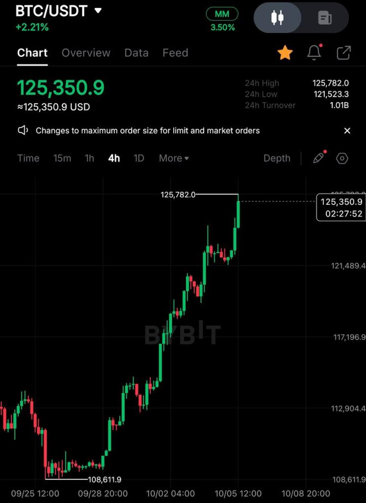 Отмечается, что биткоин достиг рекордного значения в воскресенье, 5 октября, торгуясь по 125 245,57 доллара за единицу - это рост на 2,7%. Предыдущий рекорд составлял 124 480 долларов за единицу, и был установлен в середине августа.